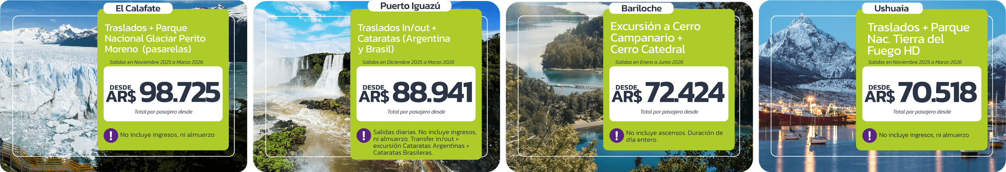 Precios comisionables por persona en base doble expresados en pesos argentinos (ARS). Incluye servicios especificados en cada descripción. Vigencia de campaña: 01ENE al 28 FEB 2026 o hasta agotar stock. Tarifas exclusivas para residentes en Argentina (mercado nacional). Alojamientos: estadías en habitación standard en Hoteles seleccionados con régimen de comidas informado en la publicación. Los alojamientos podrán ser los seleccionados a continuación o de similar categoría según disponibilidad. Alojamiento programa Salta: Urquiza, Amalinas ó Posada del Marquez. Programa Puerto Iguazú: Kelta, Bagu Siete Bocas ó Managua. Programa BARILOCHE:Hotel Concept Bariloche, Hotel Tierra Gaucha ó M382 Hotel Bariloche. Programa Mendoza: Hotel Mendoza, Hotel Crillon, Hotel Argentino o similar. No incluyen posibles tasas locales de alojamiento que deberán ser abonadas por el pasajero en destino, como ser tasas ambientales, city tax, resort fee, etc. Los horarios de check in y check out serán aplicados según las condiciones de cada hotel. Pueden ser confirmados los hoteles previstos o de similar categoría. Traslados in/out: realizados en servicio regular desde el aeropuerto mencionado, compartiendo con otros pasajeros. Actividades: son en servicio regular, compartiendo con otros pasajeros y no incluyen propinas, entradas a parques, tasas locales (de corresponder) ni comidas no especificadas. Las excursiones están sujeta a modificación o cancelación por cuestiones climáticas u otras que el grupo organizador determine. Las promociones aplican exclusivamente a nuevas reservaciones a partir de la fecha de vigencia de la campaña, no son válidas para fines de semana largos, fechas de eventos, excepto se mencione y no son combinables con otras promociones. No incluye pasajes aéreos ni servicios no mencionados en la publicación. Consultar más información a reservas@nites.travel. Tarifas sujetas a disponibilidad y modificaciones al momento de realizar la reserva. El tipo de cambio USD/ARS de referencia $1480 podría variar y afectar al precio final de los programas. Tarifas incluyen IVA. Pauta exclusiva para agencias de viajes en Argentina. Operado por Nites - Viacor SA EVT Le. 13.997. Las politicas de cancelación pueden ser flexibles o no reembolsables según programa.